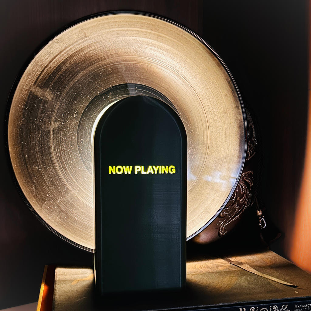 Illuminate your space and showcase your favorite vinyl in style. This unique 3D-printed lamp doubles as a vinyl record display stand and a Now Playing record sleeve holder, blending warm ambient light with a functional design made for music lovers and their music corners. The minimalist form softly diffuses light, while the vinyl record itself becomes the lampshade - creating an eye - catching, moody glow perfect for late-night listening sessions. When your record is spinning, the sleeve rests neatly in a lamp for easy display.